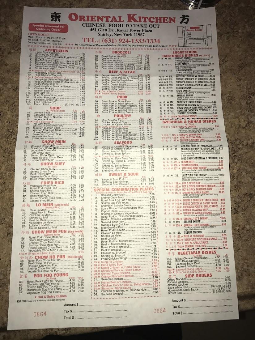 Located at 451 Glen Dr # F, Shirley, NY, Oriental Kitchens serves authentic Chinese dishes that bring comfort and flavor to your table. We welcome locals and visitors alike to enjoy a diverse menu ranging from classic lo mein to specialty items like sesame chicken and wonton soup. Whether you're grabbing a quick lunch or dining in for dinner, our prices remain affordable, typically between $10 and $20, making quality Chinese cuisine accessible to all. Our cozy, casual atmosphere invites solo diners and families alike.